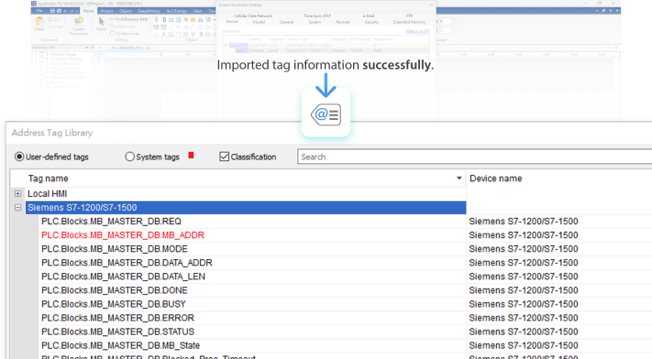 將PLC原廠軟體輸出的地址資訊檔案匯入EasyBuilder Pro,即可自動(dòng)完成設(shè)備地址列表的建立,大幅簡(jiǎn)化將PLC地址整合至HMI的過程。