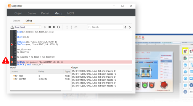 HMI軟體除錯(cuò)工具,透過監(jiān)視數(shù)據(jù)、通訊狀態(tài),與巨集程式碼除錯(cuò),透視設(shè)備運(yùn)作,加速開發(fā)流程。